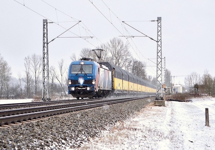 Northrail 192 009 (TX Logistik) mit ARS-Autozug in Richtung München bei Freising (21.01.2023)