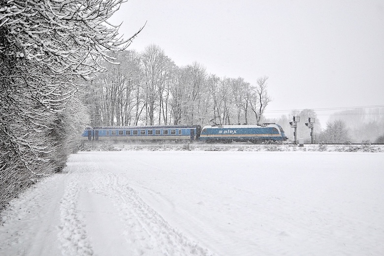Eine 183er der Länderbahn mit Alex München - Hof/Praha hl.n.bei Freising (06.01.2021)