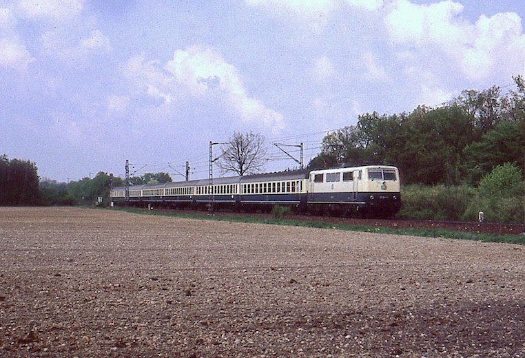 Eine 111er mit Eilzug in Richtung München im Frühjahr 1992 bei Feldmoching